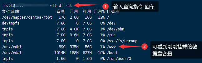 第三步,确认数据盘是否挂载成功,执行以下命令: